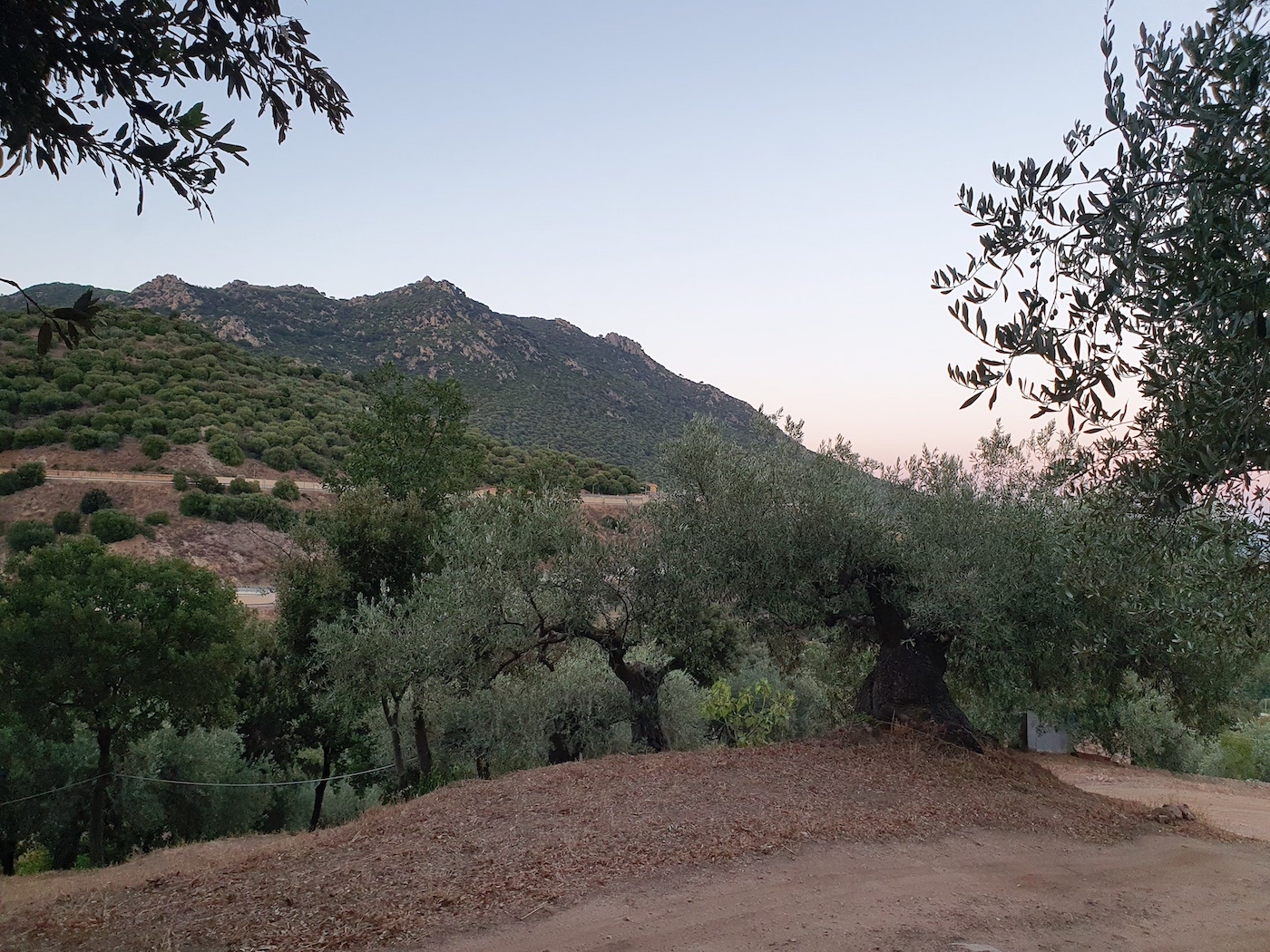Olive trees and stone oaks in the foreground. Núgoro‘s wastewater treatment plant in middle distance and Núgoro‘s mountain, the Monte Orthobene in the back.